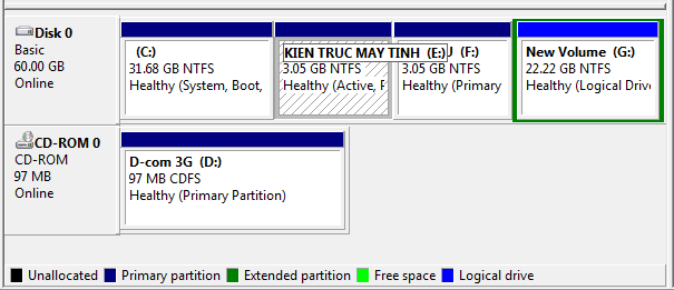 - Bạn chỉ có thể gộp những ổ đĩa gần nhau. Ví dụ: Bạn chỉ gộp ổ E với F sẽ thành ổ E, ổ F với G sẽ thành ổ F hoặc ổ C với E sẽ thành ổ C (theo hình minh họa bên dưới).