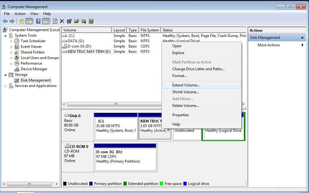 Bước 4: Chọn đến ổ E, sau đó click chuột phải chọn Extend Volume…